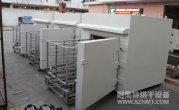 (8)烘干箱内可存放1辆推车。推车配置耐高温角轮(定向轮、万向轮各2个),推车里面安装限位柱用于定位里面托盘,两侧配有L形托架,用于支撑及左右限位托盘。进出口装有手动炉门。顶部部置循环风机、蒸气换热器等装置,排废风机安装在炉体顶部。
