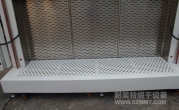 外形材质采用2mm厚冷板折弯而成,表面高温静电喷塑(非普通油漆)耐腐蚀,防生锈,外形尺寸:宽2.6米,深0.85米,高1.3米,双开门,配加强型镀铬方钢门锁,拉手,镀铬加强型合页,烤箱顶箱开有6个∮250孔.
